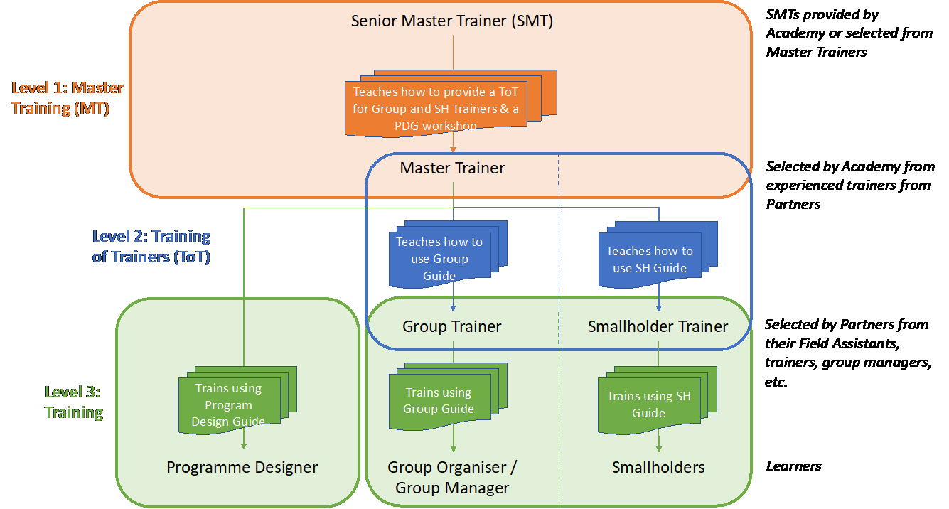 - Trainers go on to provide training directly to the learners: smallholders, group organisers/managers, or even to programme managers. Training can either be provided by the Academy-trained Master Trainers, or by Trainers that were trained by these Master Trainers. Training will use: